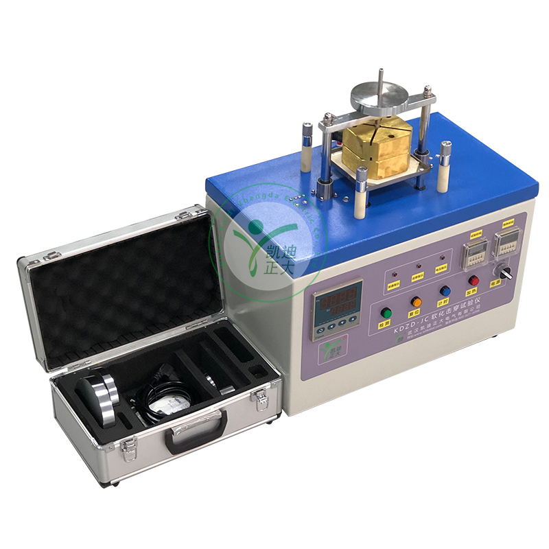 KDZD-JC軟化擊穿試驗儀用于檢測3.00mm及以下漆包線在熱狀態(tài)下漆膜軟化后的絕緣性能,根據(jù)設(shè)定的預熱溫度、試驗時間、儀器自動完成對試樣的預加熱、加負荷、加試驗電壓,達到試驗時間或試樣被擊穿時即卸負荷,發(fā)出聲光信號。該儀器采用熱電偶測溫,智能溫度控制,能自動調(diào)節(jié)和顯示試驗溫度、測試部分采用集成電路,整個測試過程自動完成。