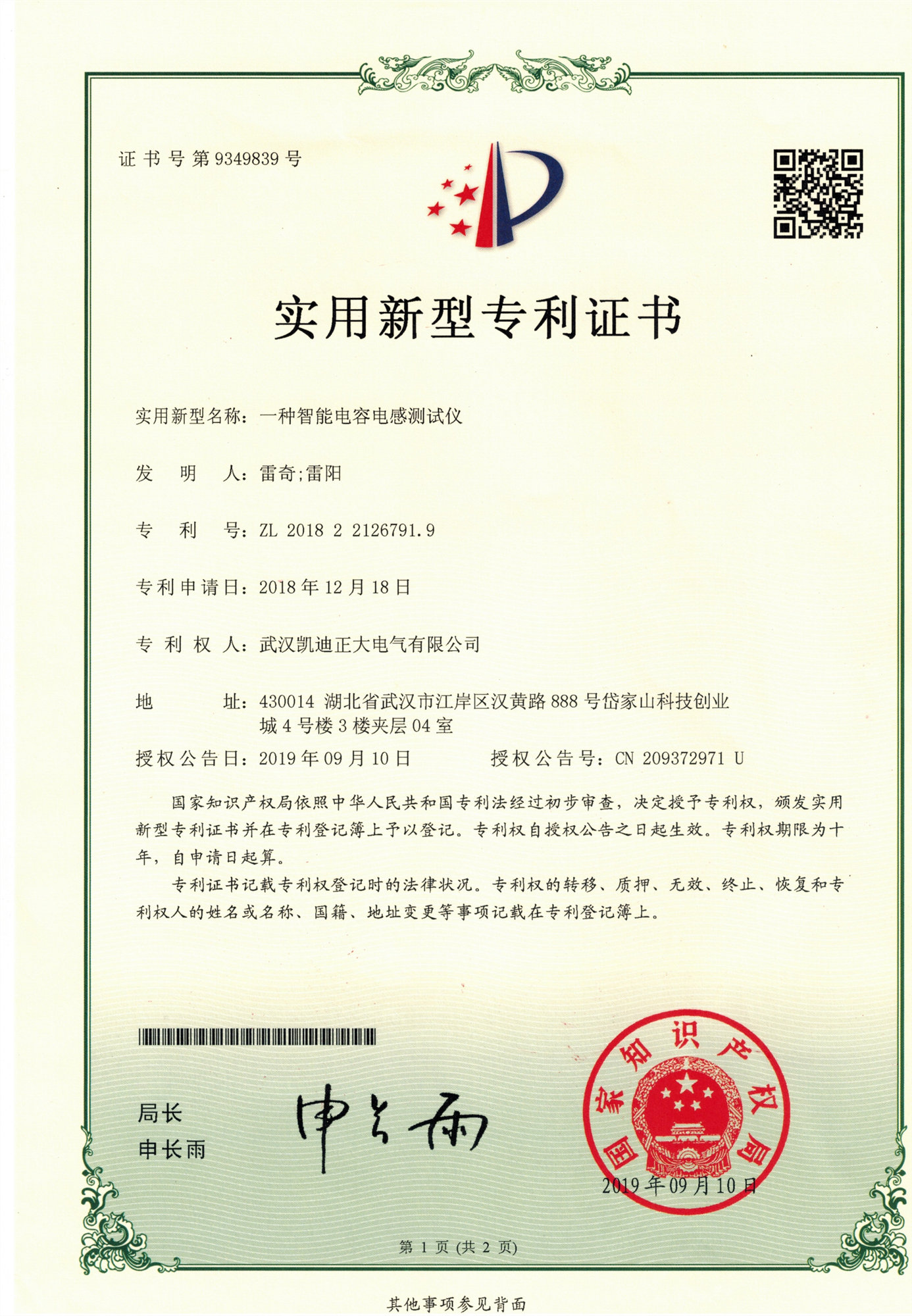 “KD-500A自動電容電感測試裝置”曾獲實用新型專利證書