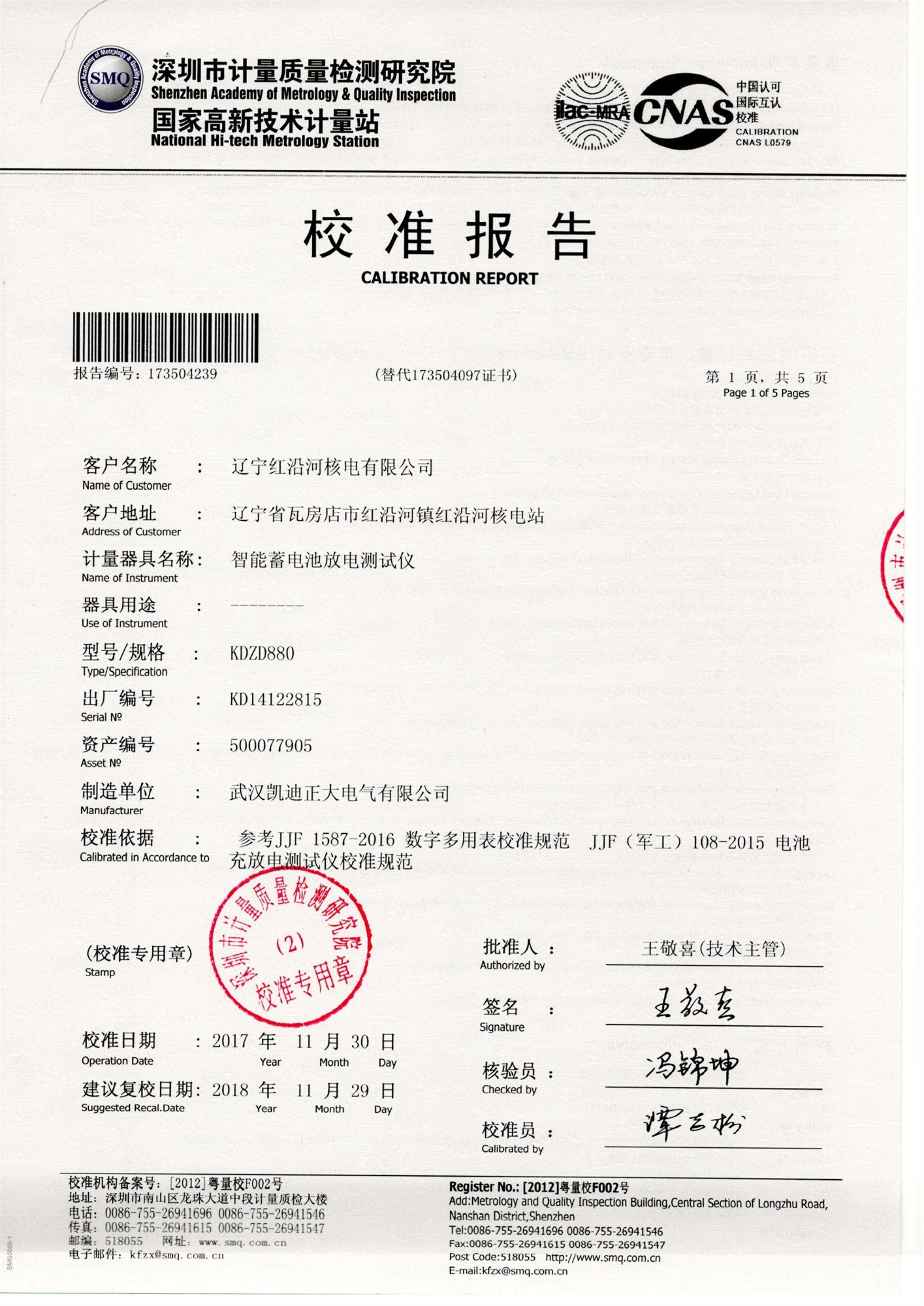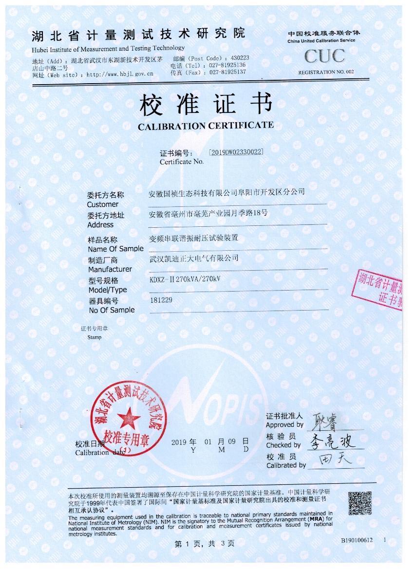 湖北省計量測試技術研究院校準證書