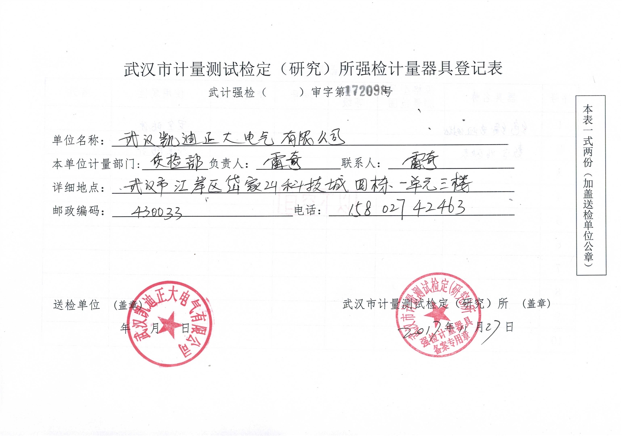 武漢市計量測試檢定(研究)所“強檢計量器具證”