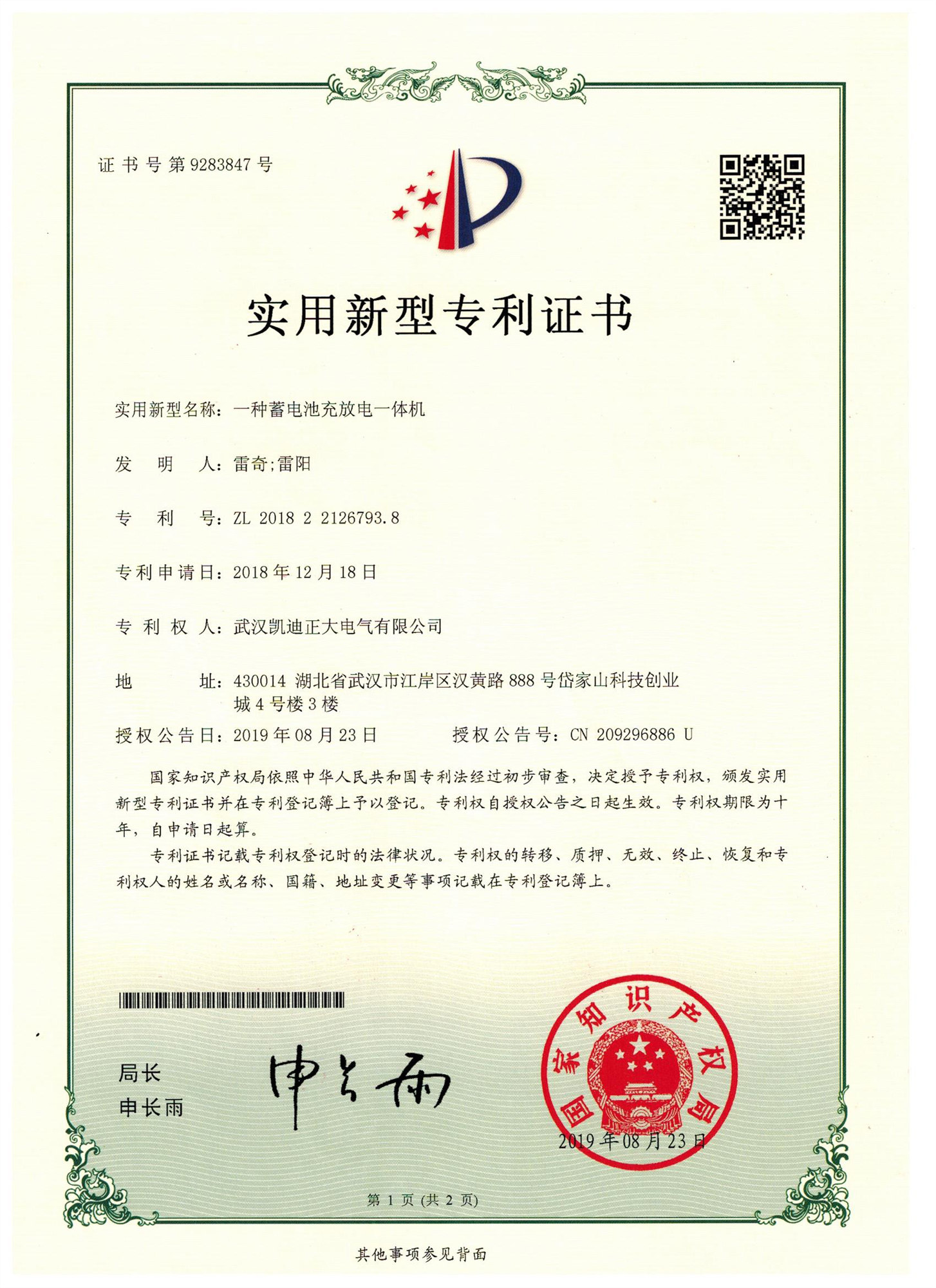 “KDZD886蓄電池充放電一體機”曾獲實用新型專利證書