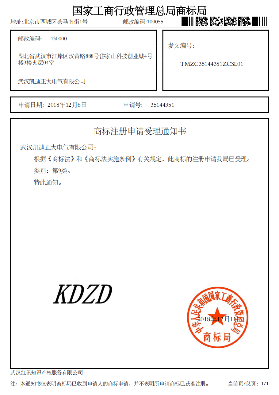 “KDZD”國家工商行政總局商標局受理書