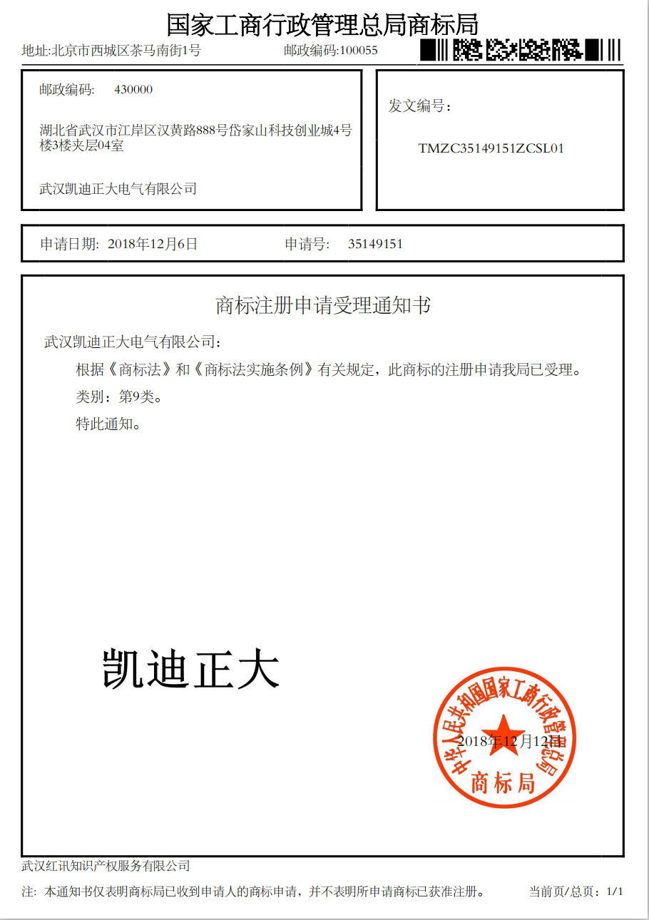 “凱迪正大”國家工商行政總局商標局受理書