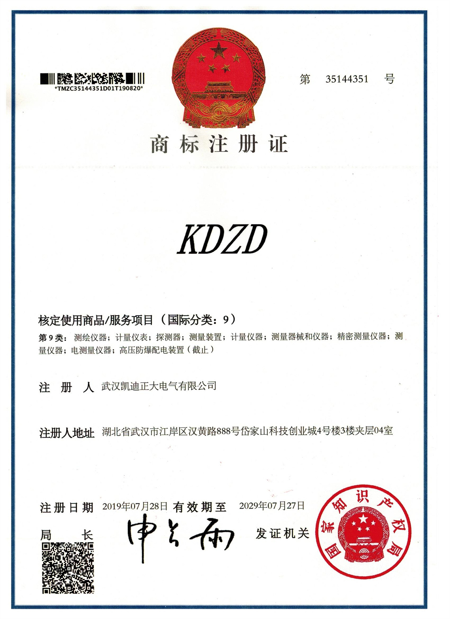 “KDZD”儀器類商標注冊證
