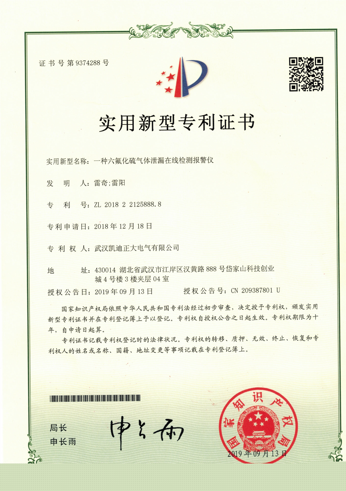 “KDXJ-8六氟化硫氣體泄漏報警系統”曾獲實用新型專利證書
