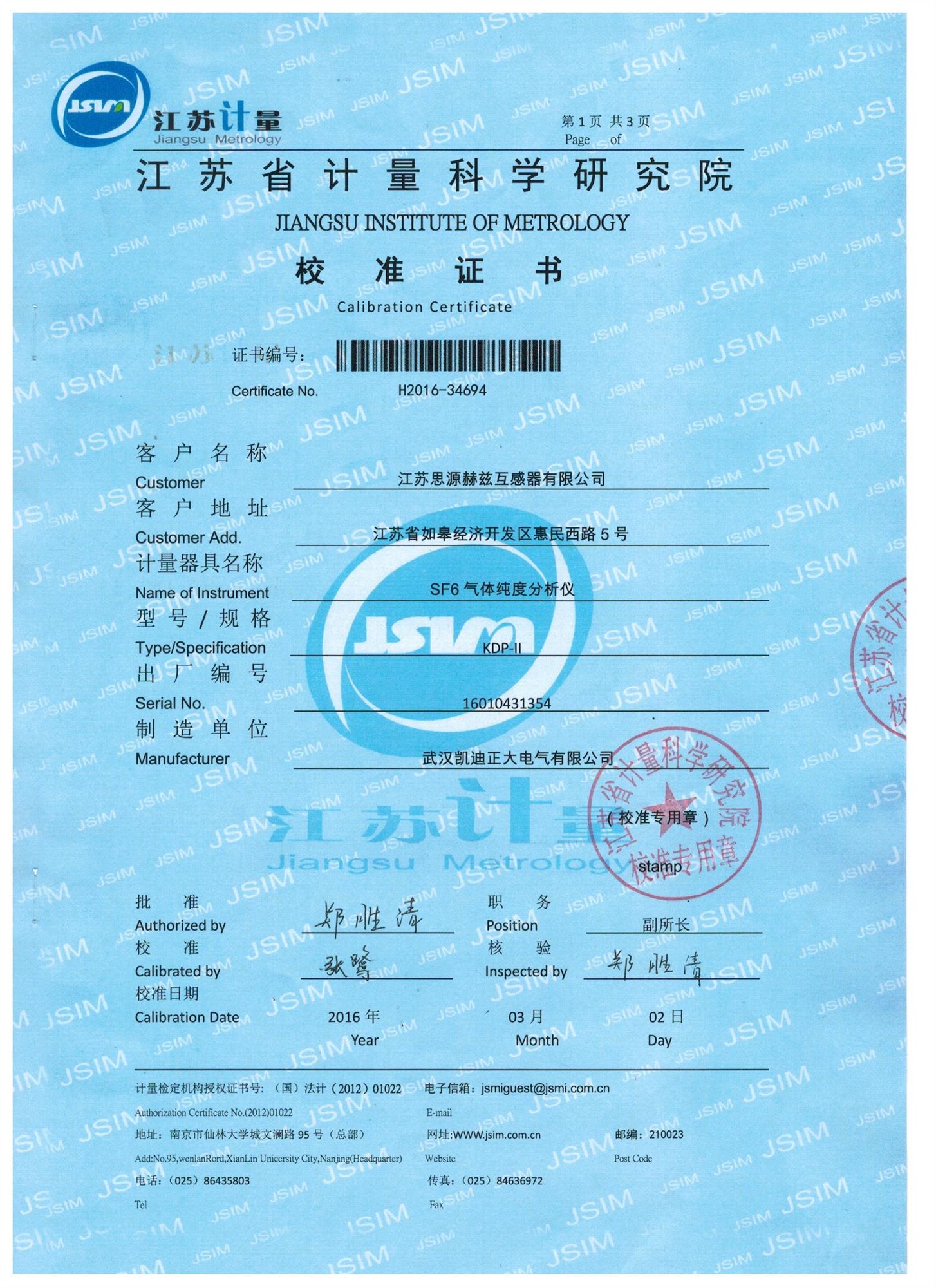 江蘇省計量科學研究院-SF純度分析儀校準證書