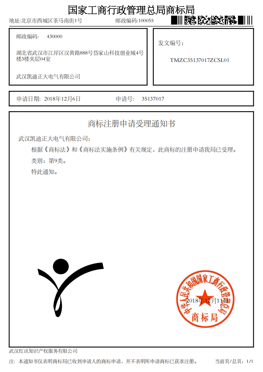 “凱迪正大LOGO”國家工商行政總局商標局受理書