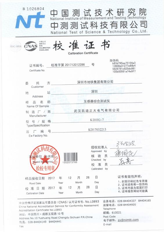 中國測試技術研究院-KDHG互感器儀校準證書