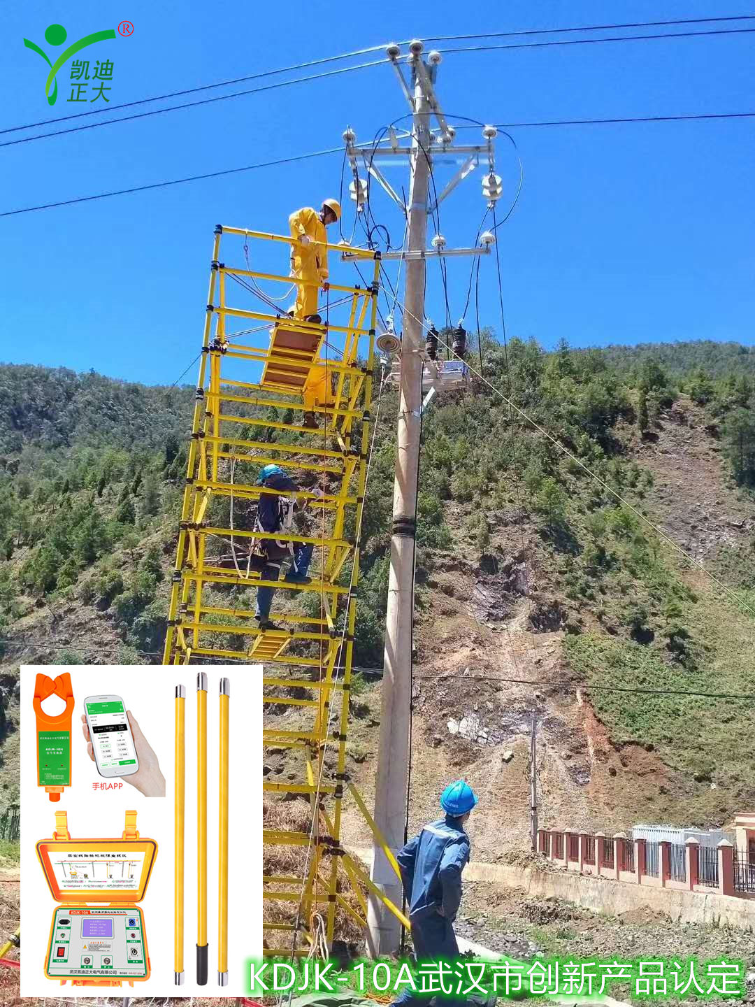 首先將故障線路的開(kāi)關(guān)斷開(kāi);使用KDJK-10A測(cè)試地線用接地線與接地棒連接,接地棒接入大地網(wǎng);信號(hào)輸出端子與高壓輸出測(cè)試線插頭端子連接,其另一端的線鼻子壓擰在接在絕緣掛線桿的蝴蝶母接線柱上,3根絕緣桿用短接線連接,再將掛線桿掛在故障線路上。