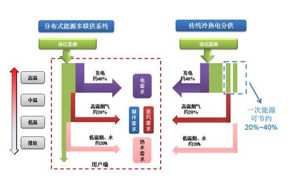 冷熱電聯供系統是以天然氣為燃料,由小型或微型設備組成,在用戶或建筑物附近,直接向用戶供應冷熱電和生活熱水的分布式能源系統。它是一種綜合能源利用率高、污染物排放少和安全可靠的能源系統,已在美國、日本、歐洲各國及國內上海等地得到了推廣應用。