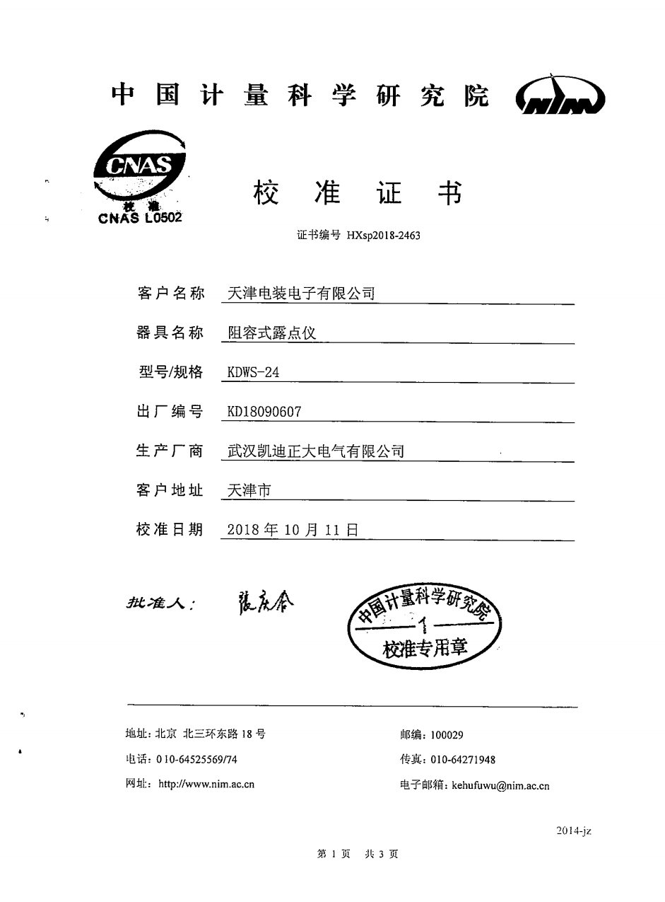 2018年10月,由天津電裝電子公司采購(gòu)凱迪正大牌KDWS-24高精度露點(diǎn)儀,產(chǎn)品編號(hào)KD18090607,生產(chǎn)廠商:武漢凱迪正大電氣有限公司。校準(zhǔn)日期:2018年10月11日。