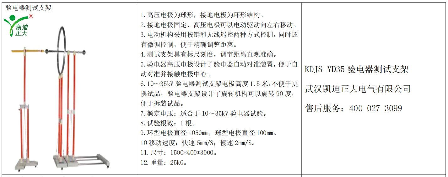 高壓電極為球形,接地電極為環(huán)形結(jié)構(gòu)。接地電極固定、高壓電極可以電動驅(qū)動向左右移動。電動機(jī)構(gòu)采用按鍵和無線遙控兩種方式控制,同時還有微調(diào)控制,便于精確調(diào)整距離。測試支架具有標(biāo)尺刻度,調(diào)節(jié)距離直觀準(zhǔn)確。驗電器高壓電極設(shè)計了驗電器自動對準(zhǔn)裝置,便于自動對準(zhǔn)并接觸電極中心。10~35kV驗電器測試支架電極高度1.5米,不便于更換試品,驗電器支架設(shè)計了旋轉(zhuǎn)機(jī)構(gòu)可以旋轉(zhuǎn)90度,便于拆裝試品。額定電壓:適合于10~35kV驗電器試驗。試驗根數(shù):1根。環(huán)型電極直徑1050mm,球型電極直徑100mm。移動速度:快速5mm/S;慢速2mm/S。尺寸:1500*400*3000。重量:25kG。