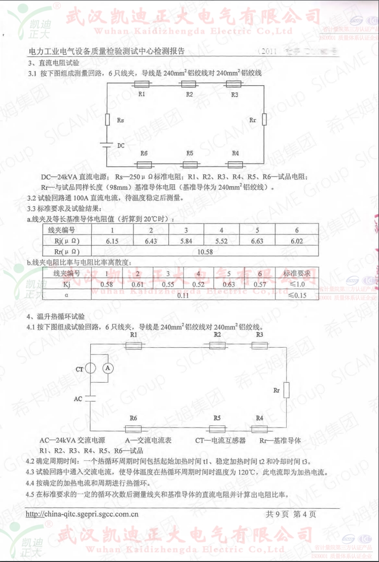 法國希卡姆集團(tuán)全資注冊的希瑪電力設(shè)備公司,2011年6月在武高所電力工業(yè)電氣設(shè)備質(zhì)量檢驗(yàn)測試中心檢定H型線夾。檢測結(jié)論:根據(jù)DL/T765.1-2001對希瑪電力設(shè)備送檢的HC650型H形線夾進(jìn)行了尺寸和外觀檢查,結(jié)構(gòu)和組裝檢查,直流電阻試驗(yàn)、溫升試驗(yàn)、熱循環(huán)試驗(yàn)、短路電流試驗(yàn)和握力試驗(yàn),檢測項(xiàng)目合格。