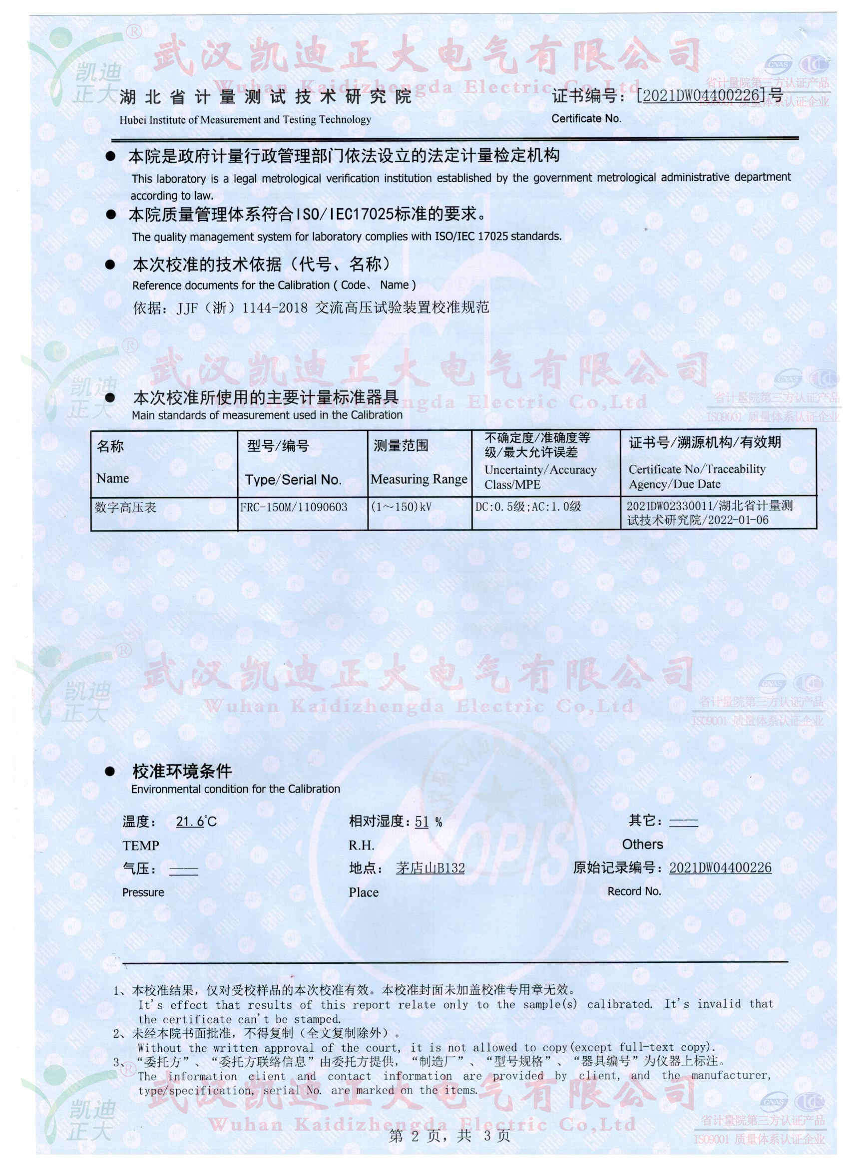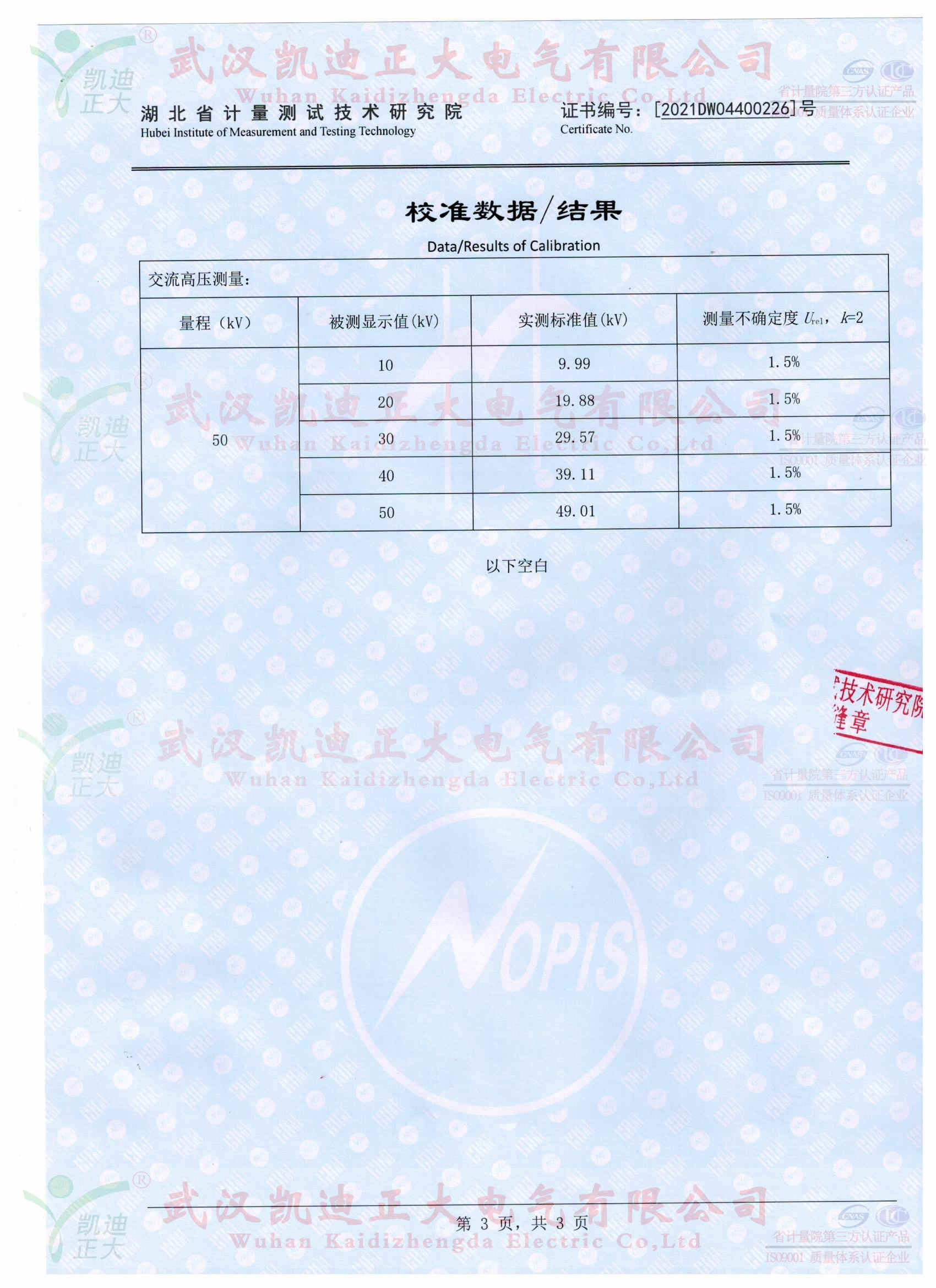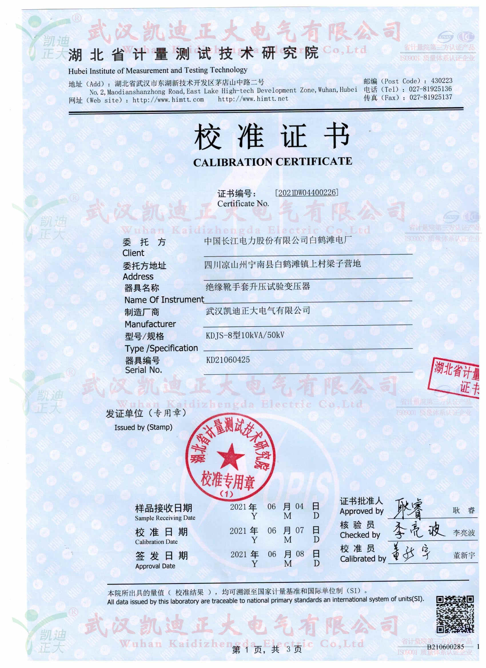 KDJS-8自動絕緣靴手套耐壓泄漏電流測試儀獲得湖北省計量測試技術(shù)研究院校準(zhǔn)證書,證書編號《2021DW04400226》,采用FRC-150M數(shù)字高壓表檢定電壓合格、產(chǎn)品各項指標(biāo)均符合國標(biāo)的要求。按《電力安全工器具預(yù)防性試驗規(guī)程》要求對絕緣鞋、絕緣手套等安全工器具進行智能化絕緣耐壓試驗,絕緣靴及絕緣手套耐試驗周期為半年,試驗過程中不允許擊穿,同時絕緣靴絕緣絕緣手套泄漏電流不大于限定值。產(chǎn)品適用于大多數(shù)與電力相關(guān)行業(yè)。