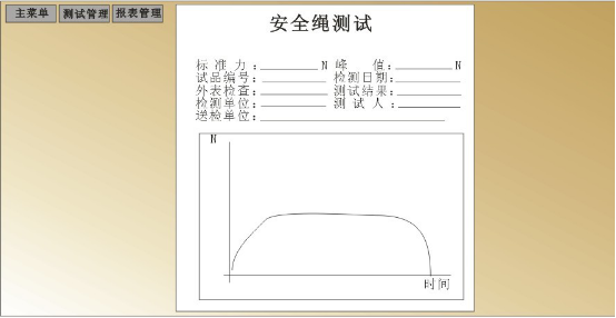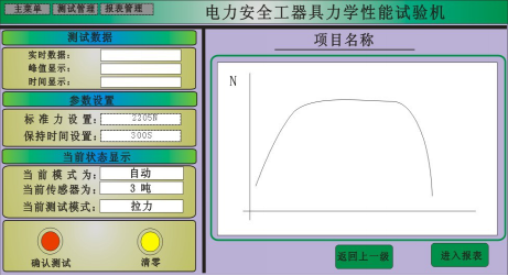 參數(shù)設(shè)置。這里要特別查看(當(dāng)前狀態(tài)顯示)的內(nèi)容,確認(rèn)是否是自動(dòng)模式,傳感器是否符合試驗(yàn)的量程,還有是否是拉力測(cè)試,確認(rèn)無(wú)誤后再做下面的事情;清零按鈕用于清除初始值。然后點(diǎn)擊確認(rèn)測(cè)試按鈕開(kāi)始測(cè)試,但系統(tǒng)力值到達(dá)設(shè)定值的20%時(shí),系統(tǒng)會(huì)自動(dòng)停止,此過(guò)程為預(yù)緊過(guò)程,若此過(guò)程有出現(xiàn)較大的變動(dòng),可能由于夾具沒(méi)夾緊,此時(shí)試驗(yàn)人員可根據(jù)具體的現(xiàn)象進(jìn)行檢查,若沒(méi)有問(wèn)題試驗(yàn)人員用鼠標(biāo)點(diǎn)擊繼續(xù)測(cè)試,設(shè)備繼續(xù)加載力值,測(cè)試數(shù)據(jù)欄中會(huì)顯示當(dāng)前狀態(tài)的受力情況,當(dāng)拉力力值達(dá)到設(shè)置的力值時(shí),開(kāi)始自動(dòng)計(jì)時(shí),設(shè)備開(kāi)始保持力,力值不過(guò)沖。同時(shí)右邊的實(shí)時(shí)曲線(xiàn)將記錄實(shí)時(shí)力值與時(shí)間的曲線(xiàn)。計(jì)時(shí)完成后設(shè)備自動(dòng)卸載力,關(guān)閉電磁閥,關(guān)閉油泵,測(cè)試結(jié)束。鼠標(biāo)點(diǎn)擊進(jìn)入報(bào)表按鈕進(jìn)入報(bào)表界面。