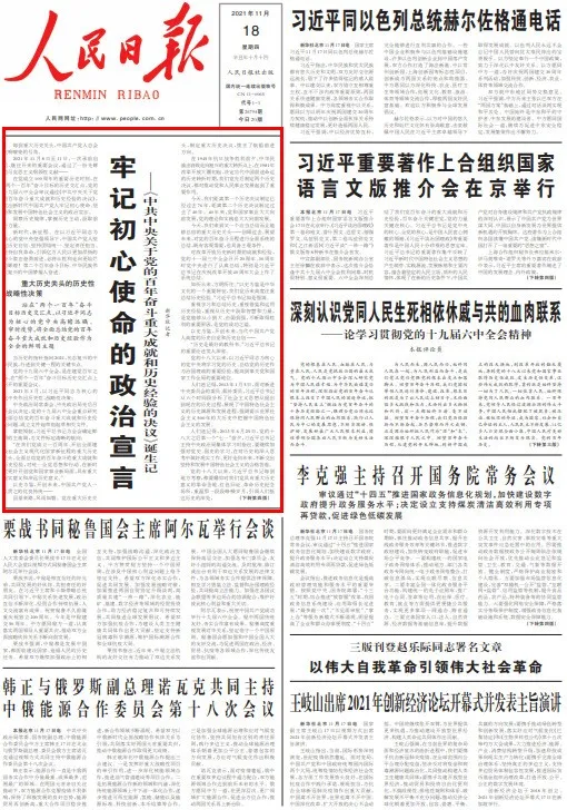 11月16日,隨著新華社發向全球的電波,《中共中央關于黨的百年奮斗重大成就和歷史經驗的決議》對外公布。