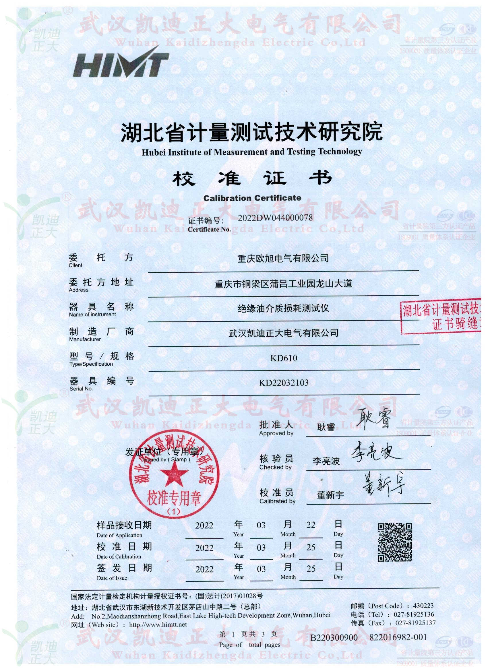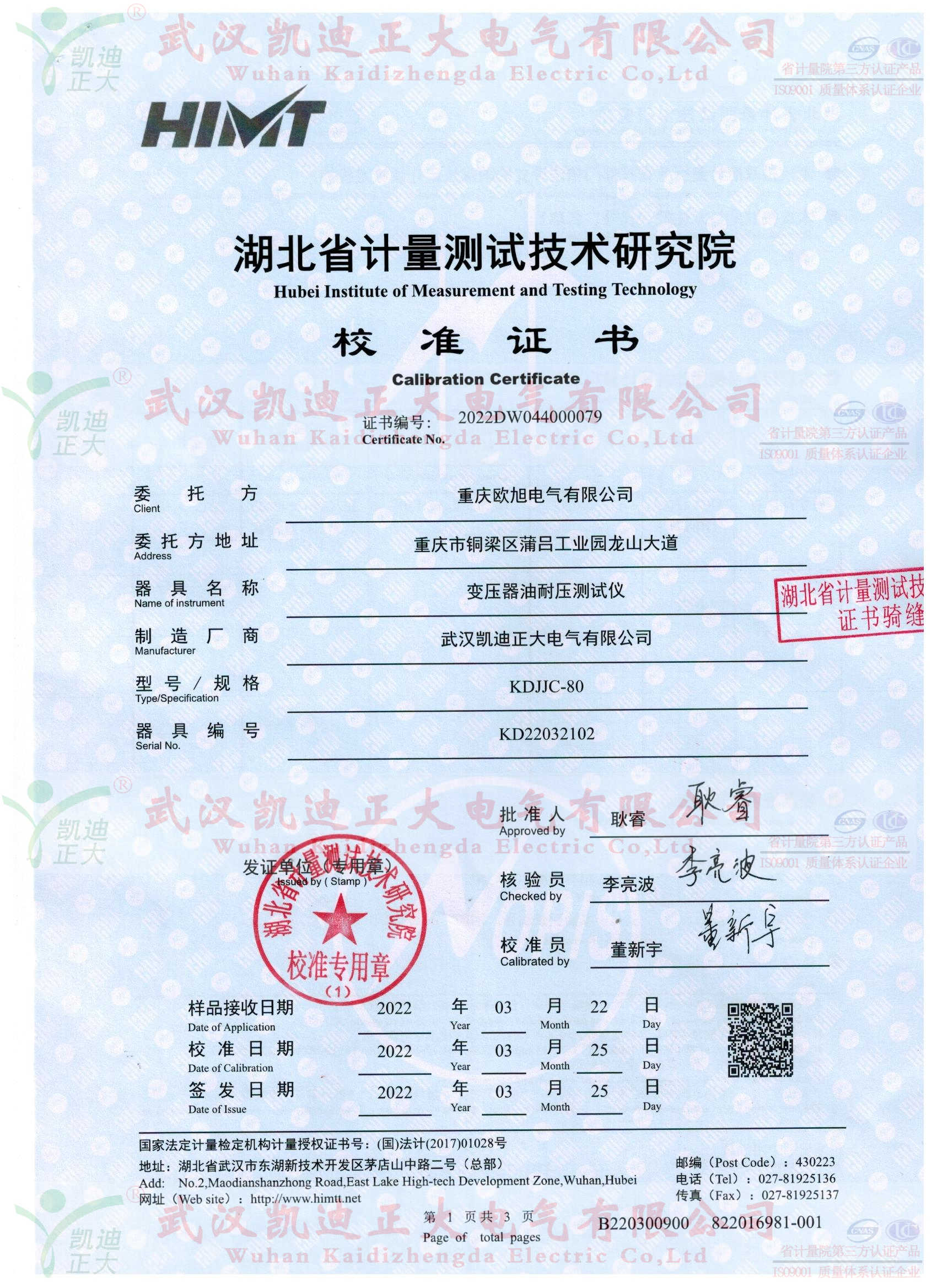 面對市場的優(yōu)劣淘汰趨勢,國網(wǎng)電力公司、南網(wǎng)等各電力企業(yè)對高標(biāo)準(zhǔn)的節(jié)能變壓器有強(qiáng)烈需求。出廠檢測設(shè)備是歐旭公司申請資質(zhì)需要的設(shè)備,在國內(nèi)優(yōu)質(zhì)變壓器檢測設(shè)備公司對比后,選擇我司KDJJC-80變壓器油耐壓測試儀、KD610絕緣油介質(zhì)損耗測試儀、KDJF-202無局放耐壓試驗(yàn)裝置(10kVA/100kV)、KDZR-10A直流電阻測試儀等試驗(yàn)設(shè)備。驗(yàn)收標(biāo)準(zhǔn)已湖北省計(jì)量測試技術(shù)研究院校準(zhǔn)證書合格報(bào)告為基準(zhǔn),省計(jì)量院是政府計(jì)量行政管理部門依法設(shè)立的國家法定計(jì)量檢定機(jī)構(gòu)。校準(zhǔn)器溯源國家高電壓計(jì)量站(計(jì))字第2021042100號。
