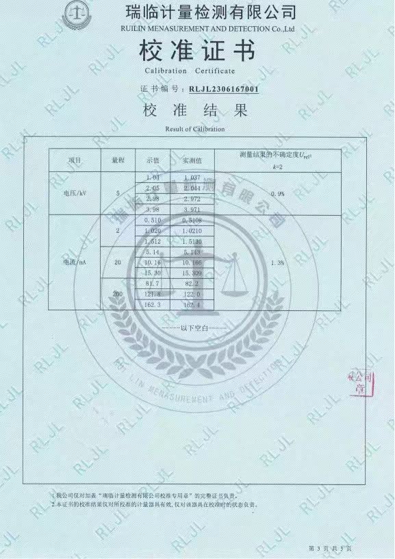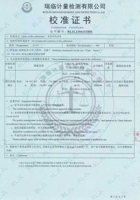 河間市質量技術監督檢驗所采購我司KDYD2675 工頻高壓測試臺,應技術要求送第三方檢測機構瑞臨計量檢測有限公司檢定。