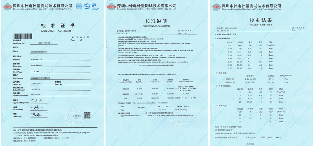 江蘇某電器有限公司采購武漢凱迪正大電氣有限公司的KDCJ-20kV沖擊耐壓測試儀、KDYD-FD放電試驗裝置、KDYD-ZY噪聲測試平衡負載系統、KD-IP2C防護等級試驗棒,通過深圳中計電計量測試技術有限公司的校準,并拿到校準報告。