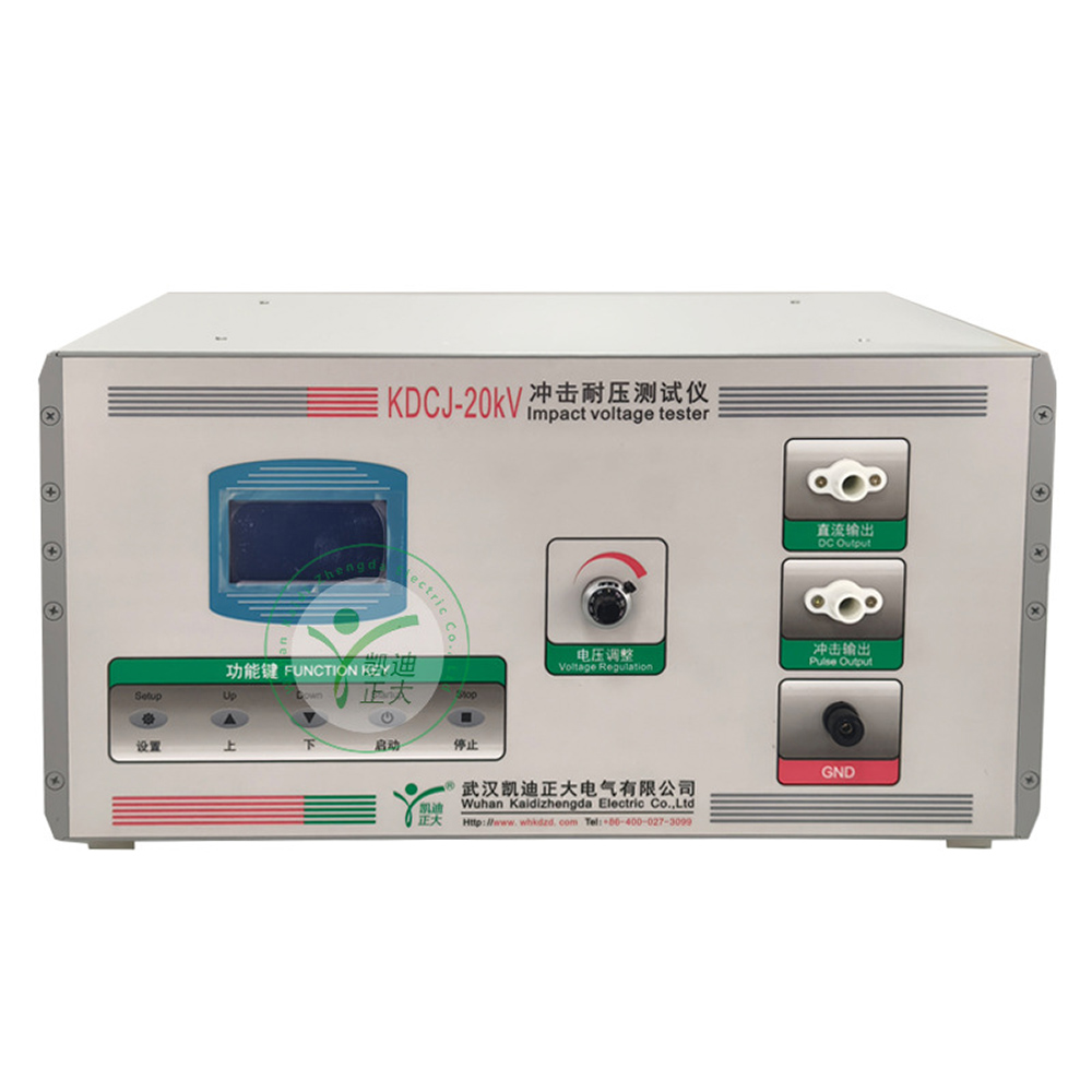 KDCJ-20kV沖擊耐壓測試儀以高速單片機為核心,通過液晶顯示及觸摸按鍵構成人機交互系統,通過中文操作菜單設置相關參數,單片機根據參數設置控制高壓發生器輸出電壓,根據設置的時間間隔控制點火裝置,經過阻容網絡輸出高壓脈沖,根據沖擊漏電流檢測是否擊穿。