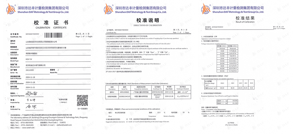 產品通過校準,意味著KDJF-IV局部脈沖探測儀的各項性能指標均達規定的標準,能夠在實際應用中提供準確、可靠的探測數據。準確的探測數據,為技術人員提供科學的決策依據,及時發現并處理潛在的設備故障,從而有效避免安全事故的發生,保障電力系統的穩定運行。