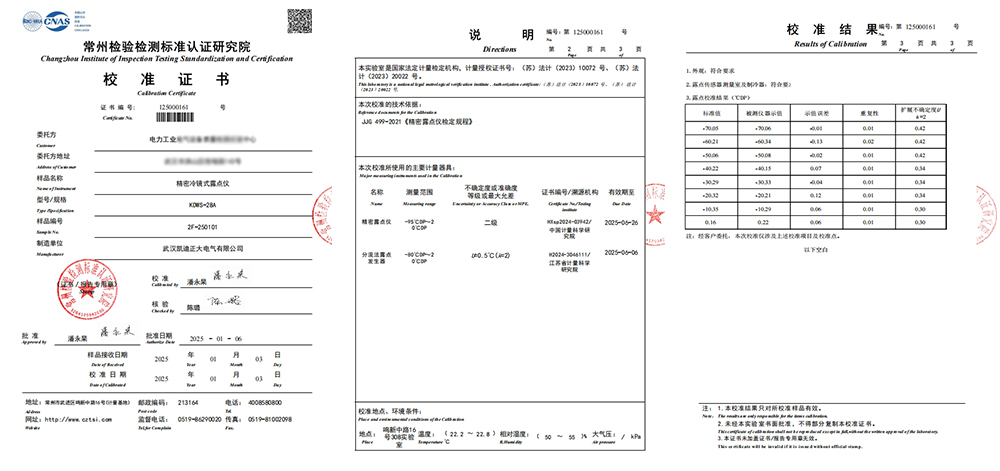 2025年1月3日,武漢凱迪正大電氣有限公司的KDWS-28A精密冷鏡式露點(diǎn)儀,成功通過(guò)了常州檢驗(yàn)檢測(cè)標(biāo)準(zhǔn)認(rèn)證研究院的嚴(yán)格校準(zhǔn),并榮獲校準(zhǔn)證書,標(biāo)志著該產(chǎn)品在工業(yè)氣體微水測(cè)量的可靠和精準(zhǔn)性。