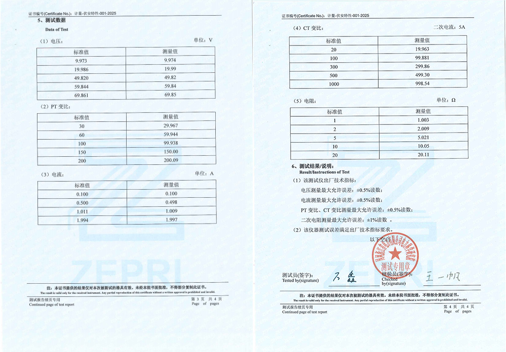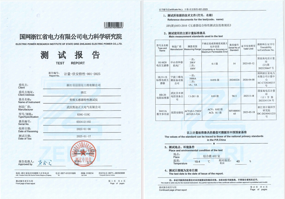 校準(zhǔn)圍繞對(duì)儀器的變比精度、角差控制、伏安特性曲線擬合度等核心指標(biāo)進(jìn)行了多場(chǎng)景模擬測(cè)試。KDHG-518C變頻互感器特性測(cè)試儀具有操作簡(jiǎn)便、功能全面、測(cè)試精準(zhǔn)等特點(diǎn),廣泛應(yīng)用于各類(lèi)CT(電流互感器)和PT(電壓互感器)的性能測(cè)試。此次通過(guò)國(guó)網(wǎng)浙江省電力有限公司電力科學(xué)研究院的校準(zhǔn),充分證明了KDHG-518C在技術(shù)指標(biāo)、測(cè)試精度和穩(wěn)定性等方面的可靠表現(xiàn)。