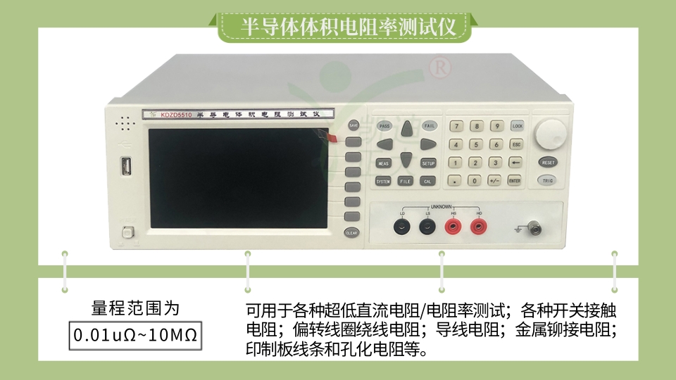 KDZD5510半導(dǎo)體體積電阻率測試儀可用于電線電纜、分流器、金屬、導(dǎo)體等各種超低直流電阻/電阻率測試。也可測量各種開關(guān)接觸電阻;接插件接觸電阻;繼電器線包和觸點電阻;變壓器、電感器、電機、偏轉(zhuǎn)線圈繞線電阻(感性負載請選用單向電流模式測試);導(dǎo)線電阻;車、船、飛機的金屬鉚接電阻;印制板線條和孔化電阻等。